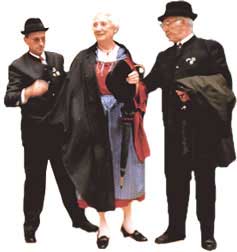 Kopfbedeckung:schwarzer runder Hut mit grünen Band und runder Krempe (bei Schlechtwetter und im Winter)