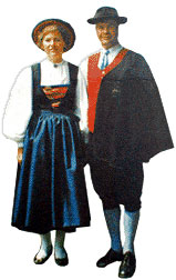 | Kittel: | Latz aus rotem Leinenstoff mit Silberborten verziert. Rücken und Seitenteil aus schwarzem Wollstoff. Rückennähte, Halsausschnitt und vordere Einfassung mit blauen Samtbändern eingefasst. |