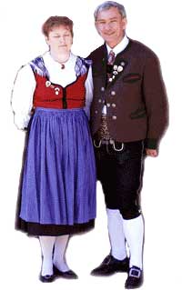 | Rock: | brauner Lodenrock mit grüner Einfassung und Stehkragen mit besticktem Revers fixiert mit je einem Silberknopf. 6 große und 2 kleine Knöpfe mit Steg als Verschluss. Ärmel grün besetzt mit je einem Silberknopf. Vier eingearbeitete Taschen mit grüner Umrandung und rotem Lodenfutter. Innenfutter aus rot-grün geblumter Seide |