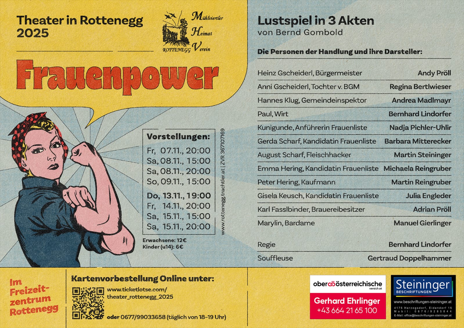 Der Mühlviertler Heimatverein Rottenegg lädt zum Theater "Frauenpower", Lustspiel in 3 Akten von Bernd Gombold herzlichst ein